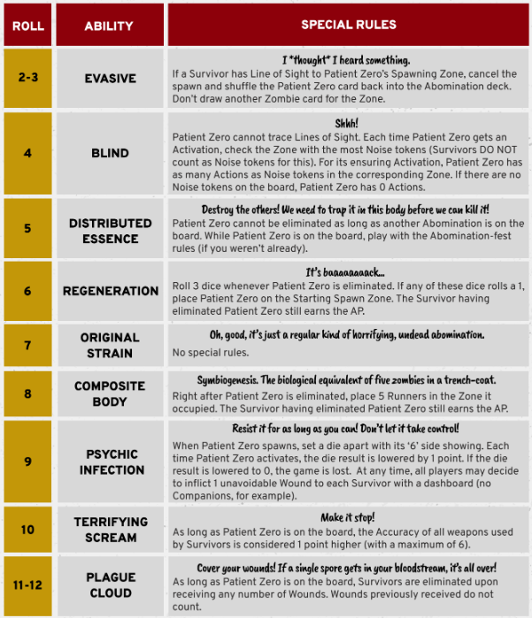 To play, print out the single-page Mutation Challenge rule sheet (or pull it up on your mobile device). Whenever you draw the Patient Zero abomination card, roll 2D6 on the mutation table. Based on that roll, Patient Zero may gain the powers of one of the Reboot Box abominations, rethemed as a random zombie mutation. Once you destroy Patient Zero, reshuffle his abomination card back into the abomination deck. If Patient Zero is spawned again, roll for a new ability.