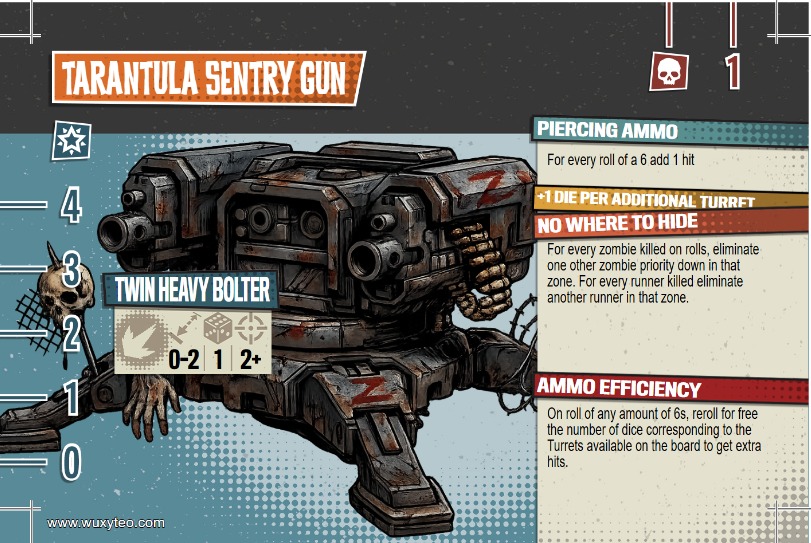 His distintive resource is the use of the Tarantula sentry gun remotely ( and no, i didn’t know that in zombicide invader there is a similar ability, i am new to these games..lol) which like a bystander also has 1 wound, but it will level up as the Techmarine levels up.